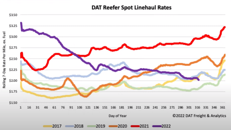 Dry van spot rates have continued their downward trend over the last eight months, now down about 46% year-to-date. Load post volumes are down nearly 30%, while truck posts are now 6% higher than they have ever been on DAT. Historically we will not see dry van load posts increase until after Thanksgiving. The East Coast and Pacific Northwest (PNW) are two areas where rates are increasing. Imports are pushing more freight on the East Coast while produce has ramped up in the PNW. Winter storms are also causing rates to jump a bit in the PNW. We have seen four straight weeks of linehaul rates increase in the PNW. On average dry van spot rates dropped $0.07 per mile over the last month and $0.80 per mile lower year over year.